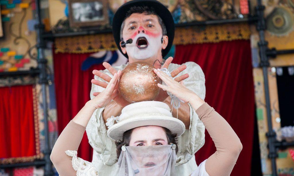 Três palhaços músicos contornados por seus figurinos oníricos, chegam de longe cantando, dançando e interagindo com o público, provocando o encantamento e cumplicidade logo de início. Os atores da trupe confrontam-se com o estranhamento e o mistério: um ser esquisito que fala e se mexe; uma bola mágica que aparece e desaparece misteriosamente. O cenário, criado pelo grupo Garrucha foi construído detalhadamente em cada ângulo e desperta a curiosidade de todos.